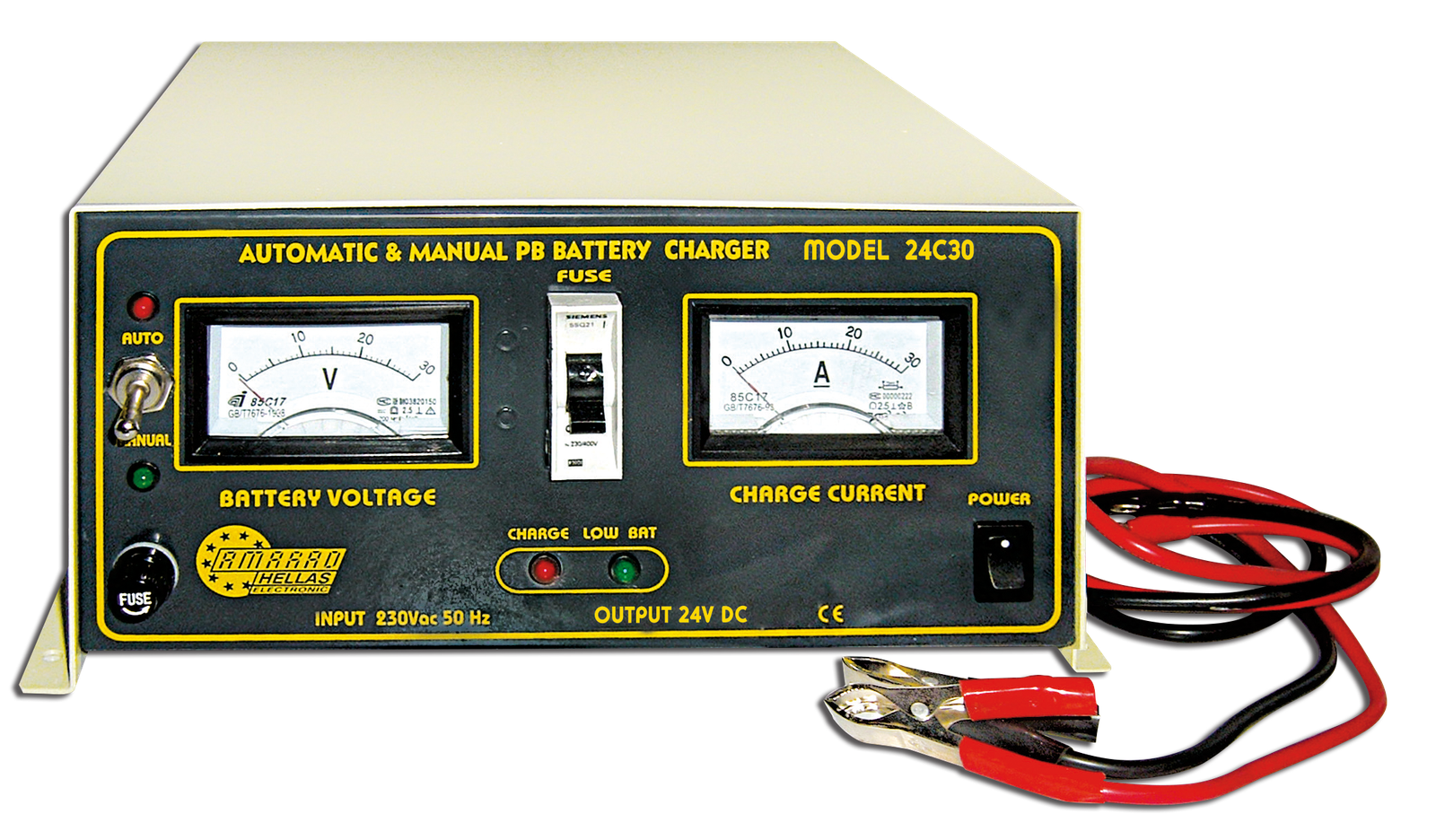 Τάση εισόδου: 230V AC 50/60HzΤάση εξόδου: 24V DCΡεύμα φόρτισης: 30A maxΠροστασία από: Υπερθέρμανση, υπερφόρτωσηΕνδείξεις: Λειτουργιών με LED και αναλογικές ενδείξεις τάσης και ρεύματος φόρτισης Κατάλληλος για την: Φόρτιση μπαταριών μολύβδου 24V (300Ah)Περιλαμβάνει: Καλώδια φόρτισηςΔιαστάσεις: 255χ250χ135mmΒάρος: 10,2 kgr