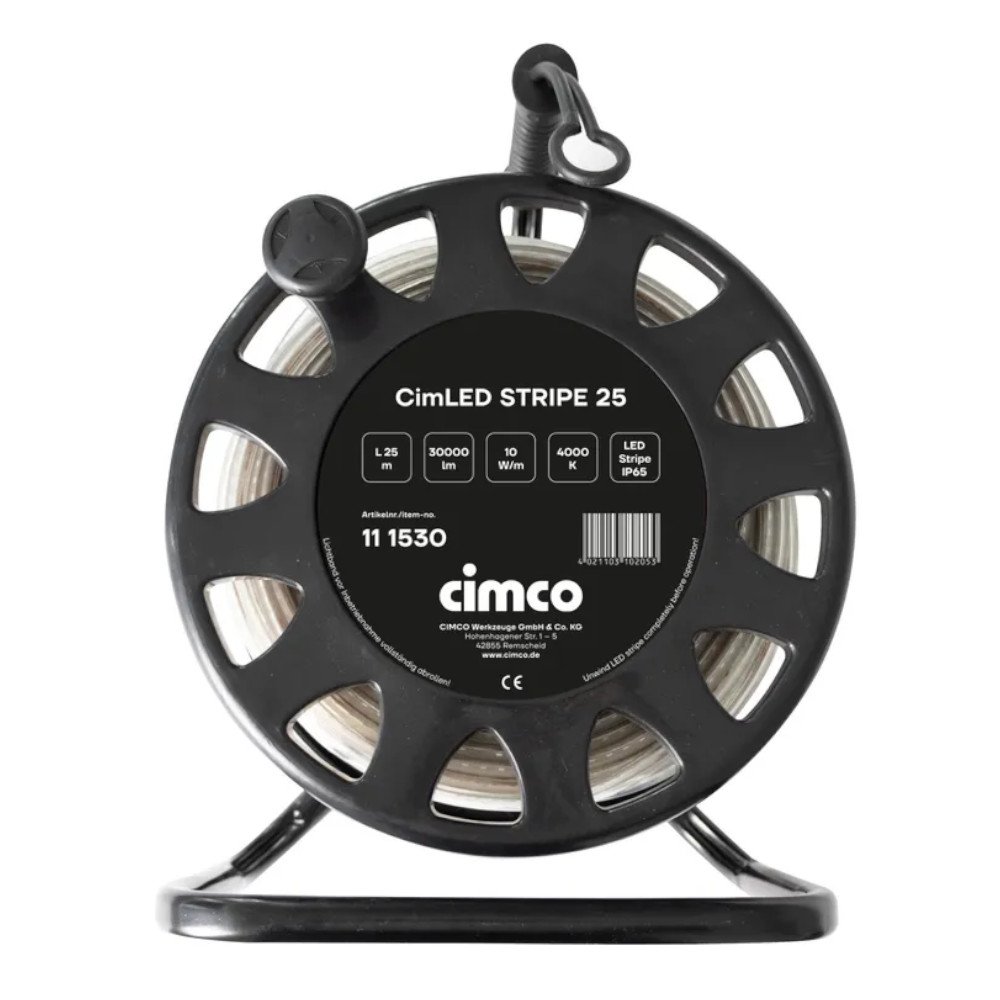 Η ταινία CimLED Stripe 25 είναι μια ταινία LED υψηλής έντασης για εσωτερική και εξωτερική χρήση. Η ταινία LED έχει μήκος 25 m, διαθέτει βύσμα ασφαλείας και είναι τυλιγμένη συμπαγώς σε τύμπανο καλωδίου. Αυτό διευκολύνει τη μεταφορά και την αποθήκευση. Είναι κατάλληλη για τον φωτισμό διαφόρων ζωνών εργασίας και κυκλοφορίας σε κελύφη κτιρίων (π.χ. διάδρομοι, κλιμακοστάσια κ.λπ.). Με φωτεινή ροή 1.300 lm/m, η ταινία LED παρέχει έντονο φωτισμό και προστατεύεται από σκόνη και πιτσίλισμα νερού με επίστρωση από καουτσούκ κατά IP65. Σημείωση: λόγω της εξέλιξης της θερμοκρασίας, η ταινία φωτισμού πρέπει να ξετυλιχθεί πλήρως πριν από τη θέση σε λειτουργία.